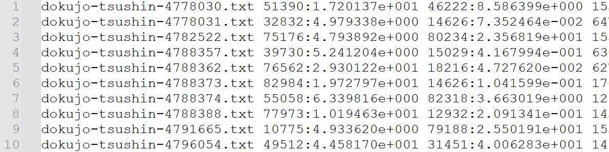 一つ目の文書が1行目で、2つ目の文書が2行目と対応しています。