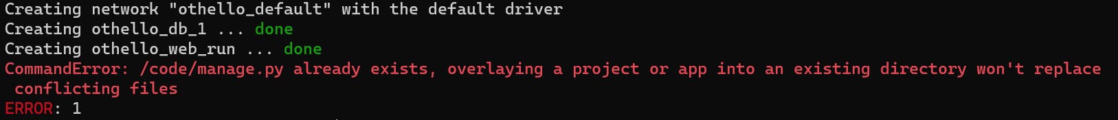 manage.py が既に存在しているのでスタートプロジェクトが作れないらしい。