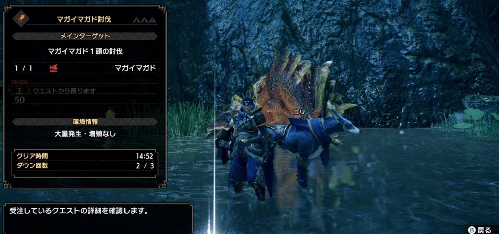 - クエスト開始と同時にアイテムボックス→ガルクに乗ってヒトダマドリ赤を取りに行く