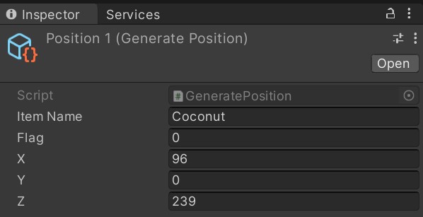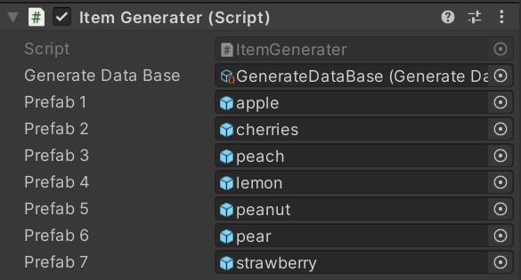 ゲームオブジェクトにはアイテムプレハブを設定して動的にインスタンス化できるようにしておきます。