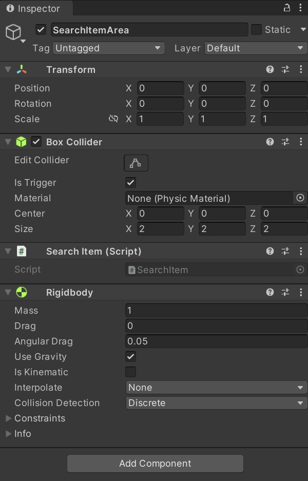 以下のサイトのように、子オブジェクトは親オブジェクトに追従するためアイテム検知エリアが離れた位置にある状況が変です。